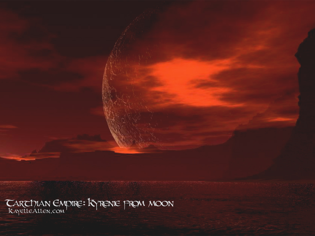 Kyrenie is home to firestorms, instant lightning-type bolts that are so hot they melt sand and create crystals. The planet is yellow when seen from space, because it’s nearly all arid desert. This scene is from one of its moons, and the atmosphere makes it appear red.
