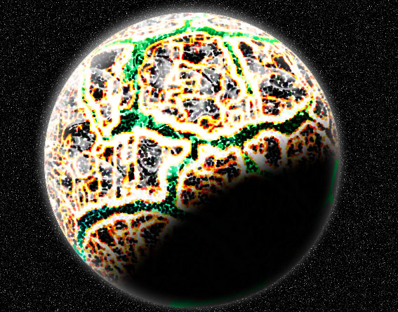 The planet Tarth is a glittering jewel in the dark night of space. The brilliant colors visible here are created from networks of shields encompassing the cities. The harmonics of the varied frequencies alter the wavelength of color, turning the rich forests and rivers into bright green and vibrant gold. Once inside the outer shields around the planet, the appearance returns to normal blues, greens and browns. Ships entering the guarded space are subject to boarding and destruction without proper passcodes…